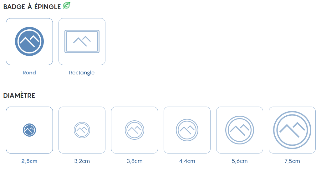 Étant donné que le badge est attaché avec une épingle, le recto est la seule face imprimée, il convient donc de maximiser la pertinence du visuel personnalisé de ce côté. Plusieurs formats sont disponibles à la commande d’impression du badge épingle. Selon que l’on souhaite être très visible ou au contraire communiquer sobrement, le badge épingle est imprimable dans une dimension de 2,5 cm de diamètre minimum. Le diamètre maximum d’impression atteint 7,5 cm pour que le badge épingle soit impactant et très visible.