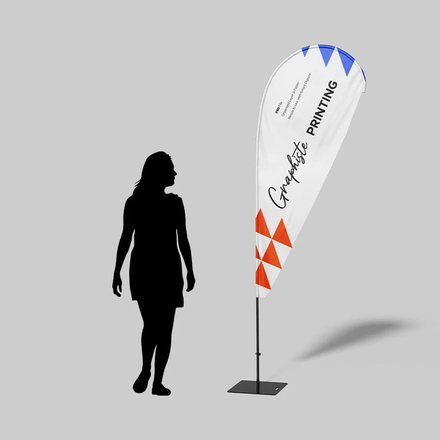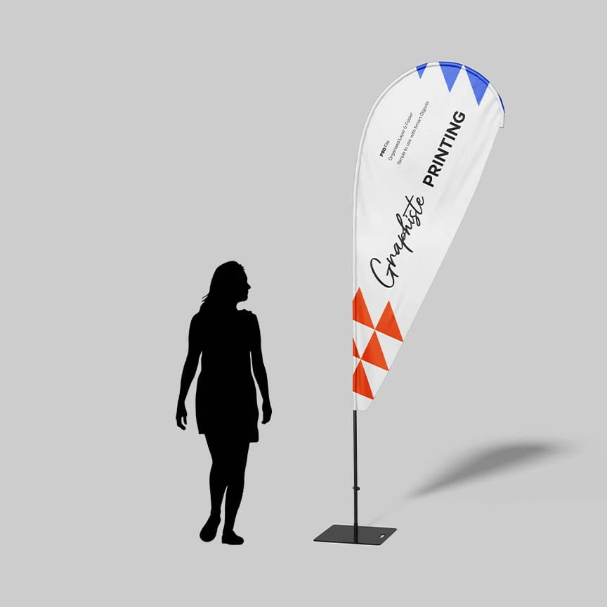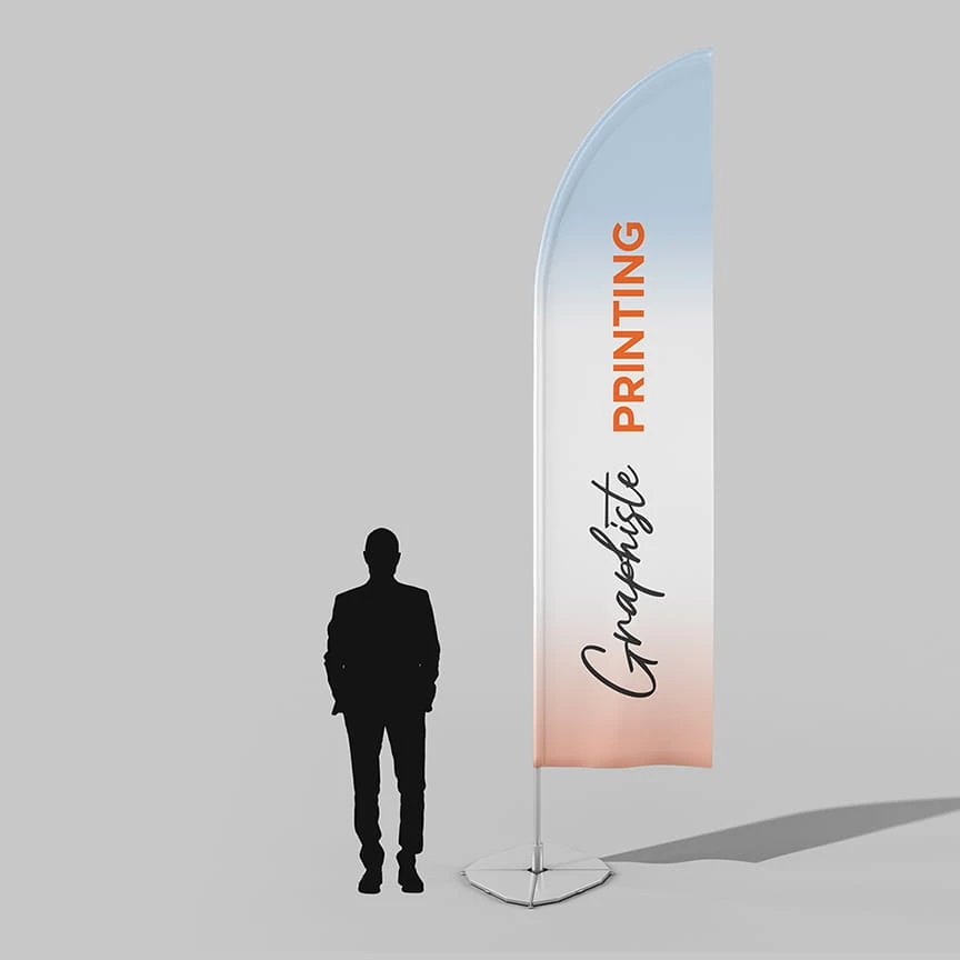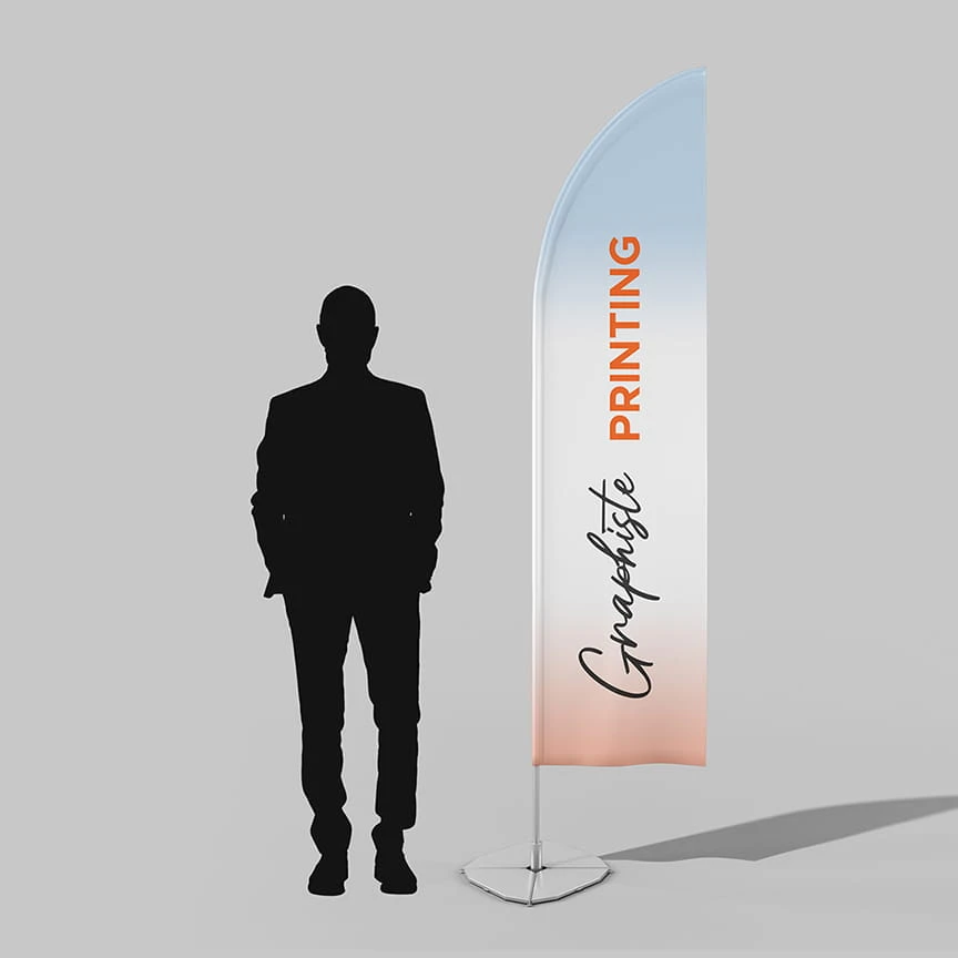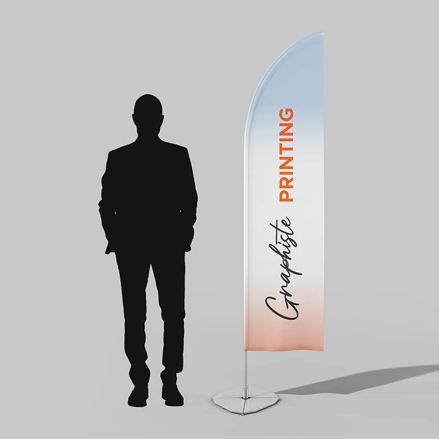 L’oriflamme est un moyen de communiquer de manière fun et stable. C’est un produit textile imprimé qui est très résistant en extérieur par jours de grands vents ou dans les intempéries. L’oriflamme est disponible sous plusieurs tailles et avec différentes options d’impression. De plus, l’impression en quadri permet une très bonne qualité.