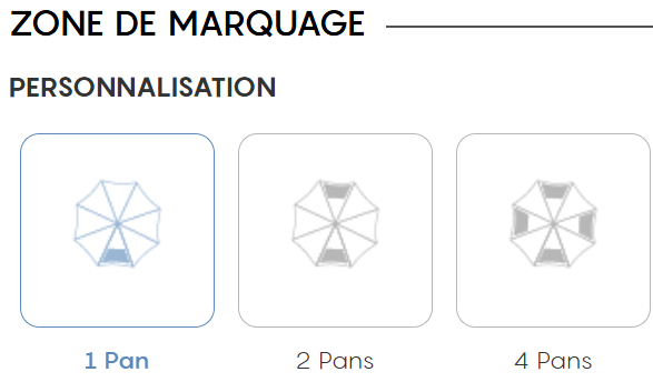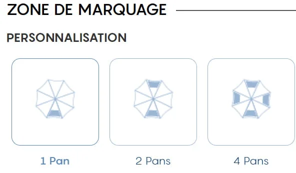 Disponible en plusieurs coloris, les parapluies de forme standard peuvent se personnaliser sur 1 pan, 2 pans ou 4 pans en fonction des besoins de vos besoins. En effet, selon l’usage et l’utilisation, vous pourrez opter pour une impression quadri ou une impression couleur.